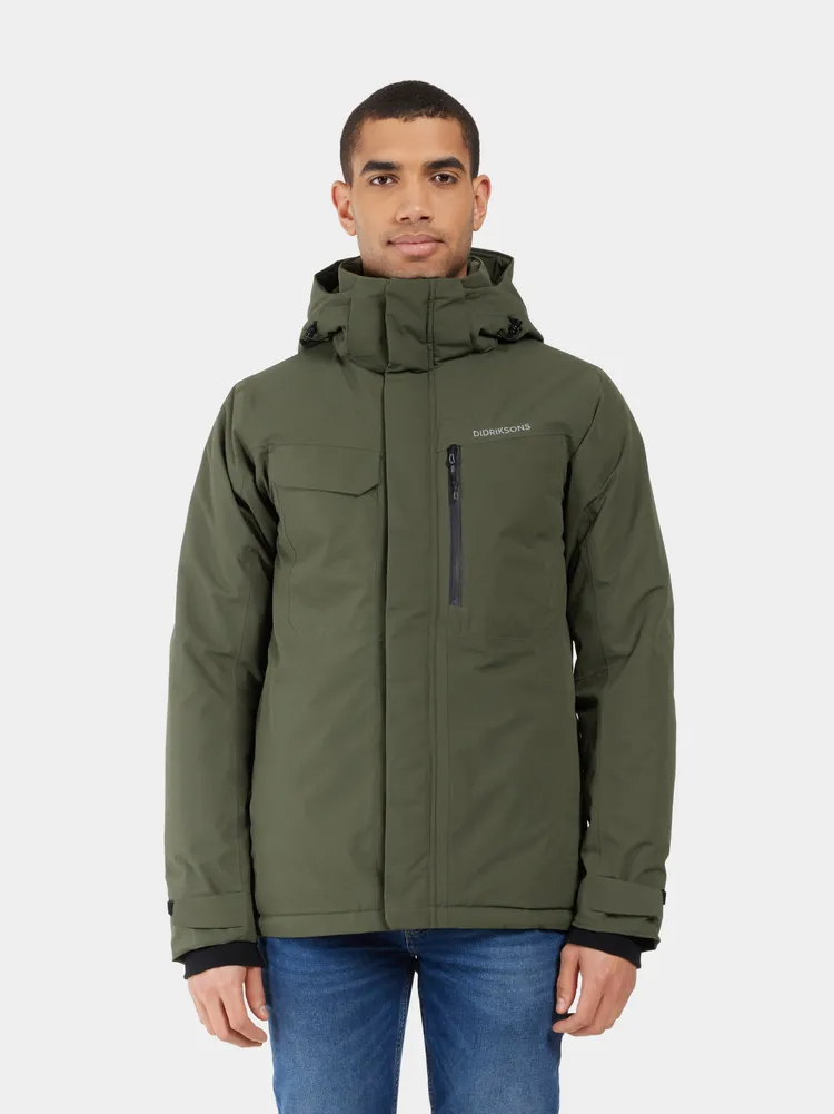 The jacket is equipped with several practical pockets, including inner pockets with zips and mesh, as well as chest pockets with both zips and buttons. The side pockets have zips for secure storage. The cuffs are adjustable with Velcro and have an elastic inside for extra comfort. The jacket also has a drawstring at the hem to adjust the fit.