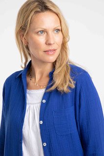 We love the Suria Double Cloth Shirt, for its versatility. This lightweight casual shirt is cool enough to wear as a beach cover up, as a smarter style with some chinos, as a loungewear outfit, or just with your favourite jeans. The muslin style material feels great and doesn't need ironing thanks to its intentional, crinkle texture. Double cloth is made when two muslin type materials are joined together, making a more substantial, but still very lightweight and breathable textile.