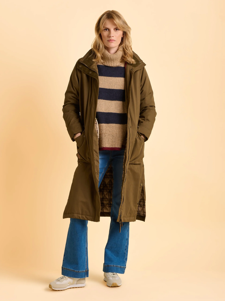 As the colder months roll in, this green longline padded jacket is your new winter walking essential. Lined with quilted red and plaid fabric for extra comfort, it features a corduroy collar, internal drawstring for shape, and large front pockets. Layer over a cosy jumper and walking boots.